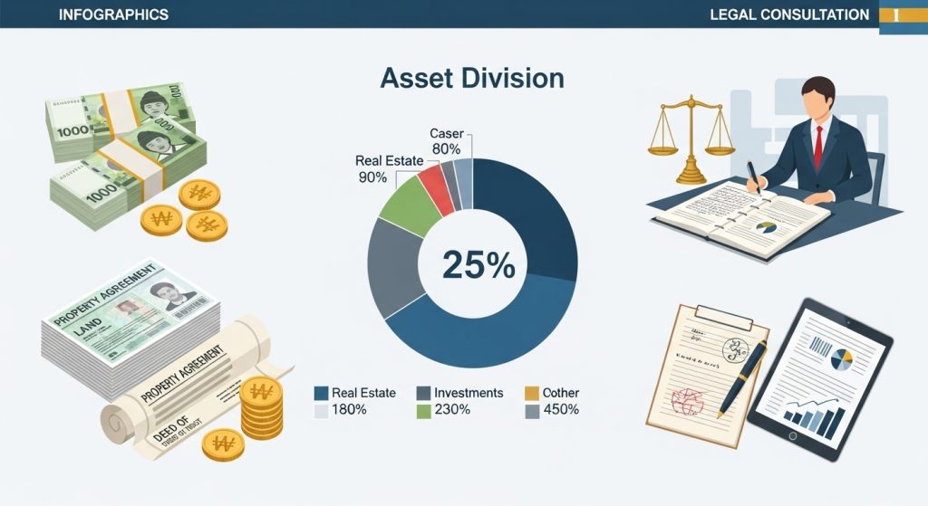 재산분할 대상에 포함되는 항목은 부동산(주택, 토지), 금융 자산(예금, 적금, 주식, 펀드), 퇴직금 및 퇴직연금, 사업 자산(개인사업자의 경우), 자동차 등 유형 자산, 보험 해약 환급금 등입니다.